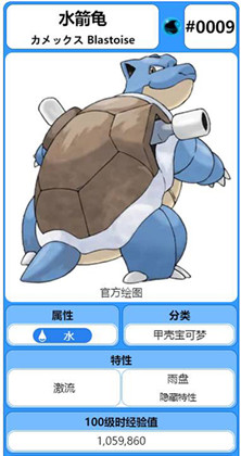 水箭龟属于水属性宝可梦,这是一种体型庞大的龟形宝可梦,主要以两足行走,偶尔也会四足着地。水箭龟的体色为深蓝色,其前后肢短且粗壮,因关节而呈现分节状,并且前后肢均长有三趾。