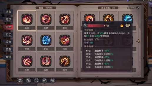 连击:普攻后追加特殊攻击,伤害低于普攻,但可以触发各种特效。任何流派都可以用的神技!不管是连击增伤还是增加印记叠加效率,就算是反击普攻也能触发连击。除非你不普攻,不然带上连击准没错!