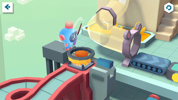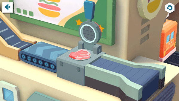 煎锅处的机器人已等候多时,宝宝快使用锅铲弹弓,瞄准煎锅,发射生肉块!听,肉块在锅中滋滋作响,待其变熟即可前往下个地点。
