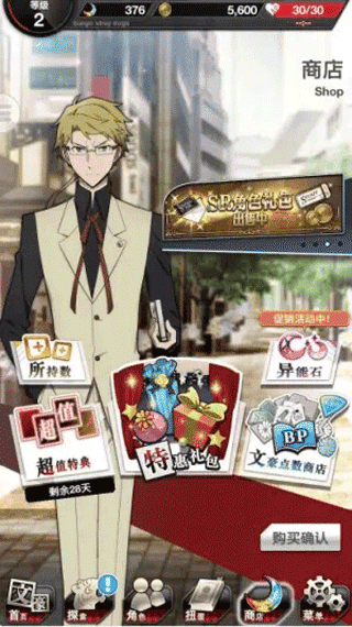 在此处能够购买异能石以及各类游戏礼包,其中涵盖异能石商店、特惠礼包、超值特典(月卡)还有文豪点数商店等。