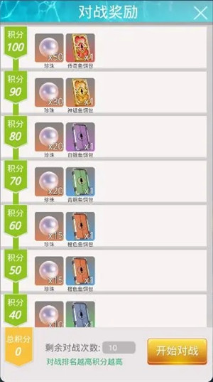 4、每日都会刷新免费10次的对战次数,只要按照攻略方法去操作,那么海量的珍珠、鱼饵统统都收入囊中,助您快人一步升级鱼饵,高等级鱼饵也将助你在【重量赛】收获更重的渔获!