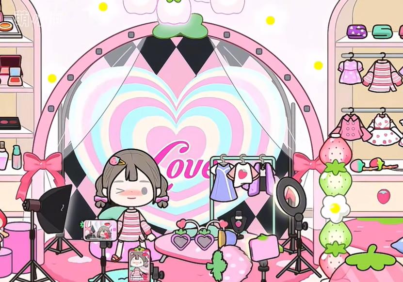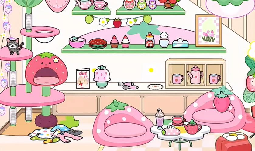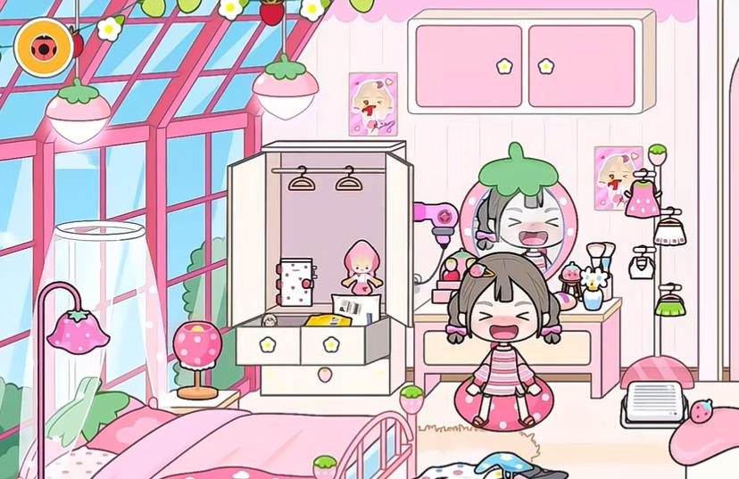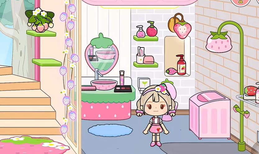 3.再往里走就是浴室,也是粉色系,更新了草莓系列的衣服和头饰