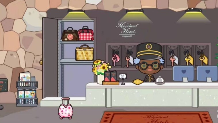 3.来到酒店一楼,打开保安后面的柜子,里面有一个可爱的粉色猫咪行李箱。把里面的东西拿出来装上我们自己的东西,出门旅游时必备的一个行李箱。