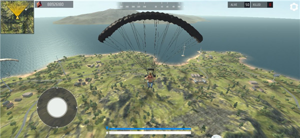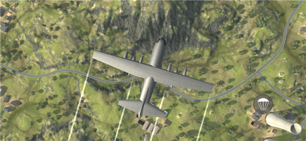 5、进入游戏后,画面如图所示,玩家将搭乘飞机开启大逃杀之旅,此时需点击右下角的降落伞按钮。