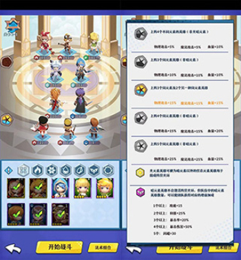 我方上阵5名英雄,根据上阵角色的元素属性存在增益的加成,同元素阵营英雄越多属性加成越强力。此外还有光与暗两种元素较为特殊,其中光元素可视为暗元素以外任意元素阵营填充增益光环,暗元素阵营则是有相对独立的属性加成。