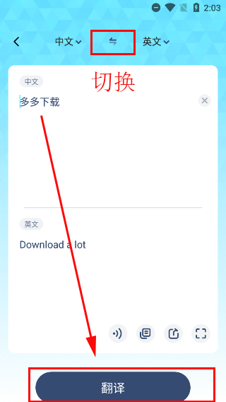 1、文本翻译十分简洁明了,在最上方对话框中输入想翻译的文本后点击翻译即可