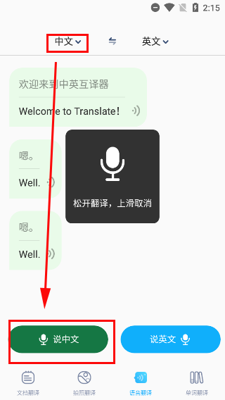 3、关于语言翻译,在上方进行切换,就能直接更改输入的语种。按住下方的录音按钮即可开始说话,说完话松开按钮,便会开始翻译。