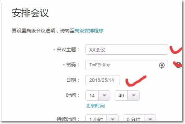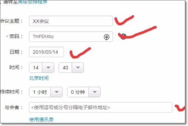 5、输入安排会议的主题 、密码、会议日期、时间 会议时长 ,输入与会者邮箱。