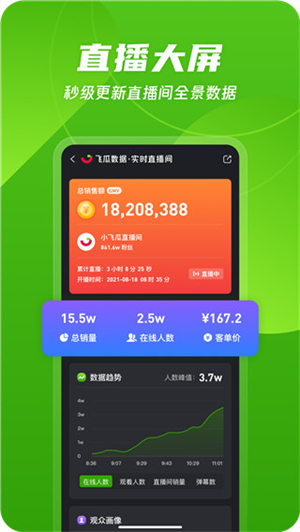 5、行业大盘:每60s统计当前时段带货直播热度及实时观众热度、上架商品热度等数据,支持查看直播间各品类商品热度汇总数据,了解直播间卖货风向。
