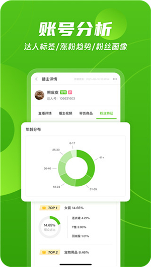 1、分析账号运营数据,定位用户画像以及粉丝活跃时间,更好了解用户的观看习惯,并同步列出近期的电商带货数据和热门推广视频,大数据分析账号带货实力。