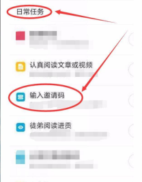 第五步,点击“日常任务”之内的“输入邀请码”选择。“输入邀请码”选择,在“认真阅读文章或视频”和“徒弟阅读进贡”之间。