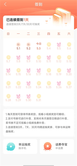 支付书券可进行补签,支持对本月漏签日期进行补签若书券不足可观看小视频免费补签;