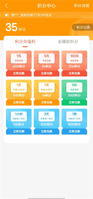 2、积分可以兑换各种福利,如6000积分可以换1元话费、1500积分可夺取1天专属vip、5000积分可换取100专属书券等等。