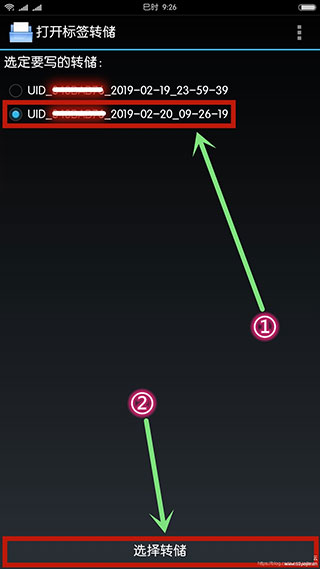 9、勾选刚刚保存的标签,选择后点击软件最下方“选择转储”进行下一步操作(须注意的是,此时需将CUID空白卡至于手机NFC感应区)。