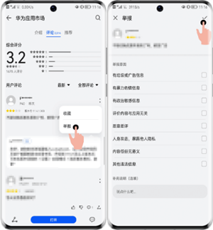 若您发现当前展示的评论存在违法违规等情况,可以点击评论右上角“:”,选择举报评论,勾选评论存在的问题类型及描述举报原因后提交,评论审核人员收到您的举报后会对该评论重新按审核规则进行复审,如存在违规会进行审核不通过(屏蔽该条评论/回复)。