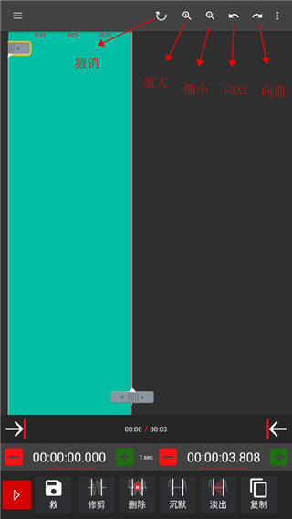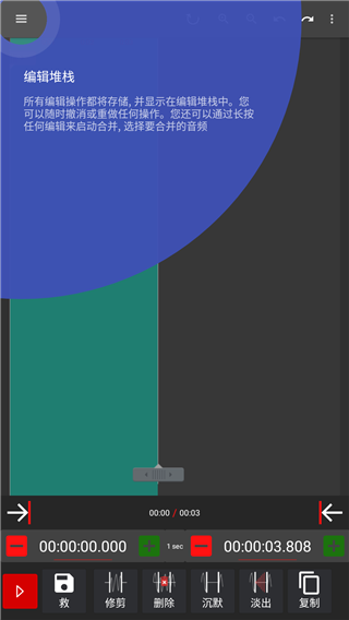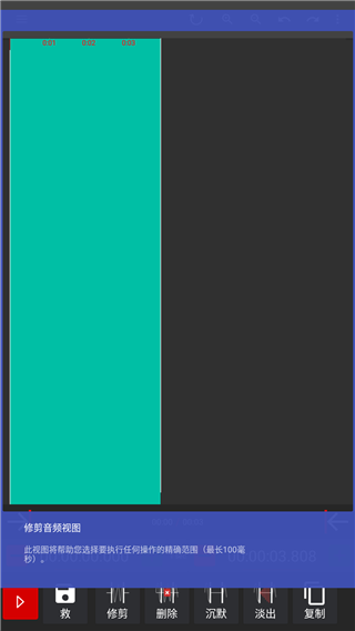 2、以剪辑音频为例,小编这边会先选好一段要处理的音频文件并打开(也能现场录制),之后就能看到该文件在音频视图中展开。在此视图里,可以剪辑音频长度,最长能达到100毫秒。