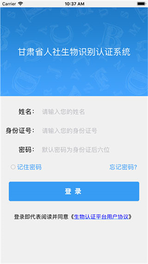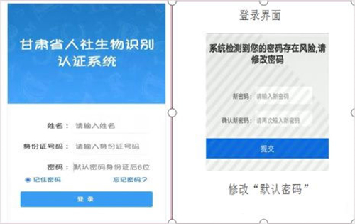 1、首先打开甘肃人社认证生物识别系统app→输入姓名+身份证+密码(默认身份证号码后6位)→点击“登录”按钮(默认第一次登录需要修改登录密码)→完成登录。