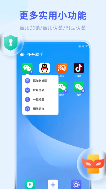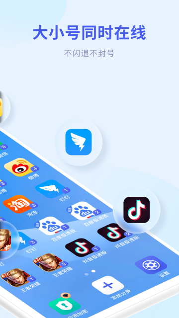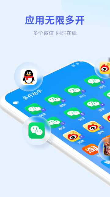 一部手机轻松实现微信双开、微信多开、QQ多开、派派多开、陌陌多开、淘宝多开、闲鱼多开、游戏多开等几乎所有应用的多账户同时在线,完美解决用户多账户同时在线的需求;更有应用锁等隐私保护功能!