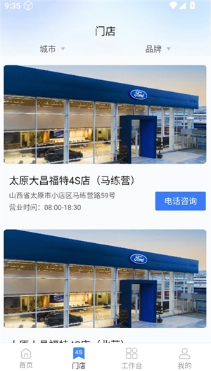 3、进入门店界面,你能瞧见遍布全国各地的汽车销售网点,同时还提供电话咨询与路线导航服务。