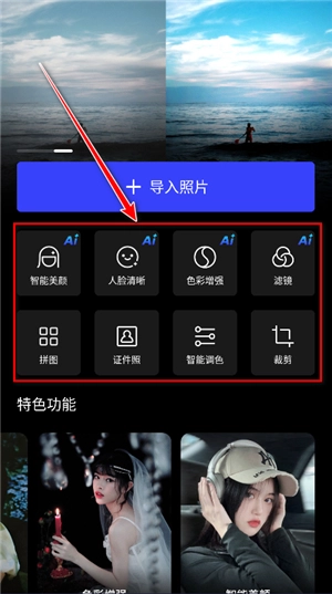 6、当然了主页还有很多种功能可以使用,比如智能美颜、人脸清晰、色彩增强、证件照等等,大家想用哪个就直接点击哪个功能就好了。