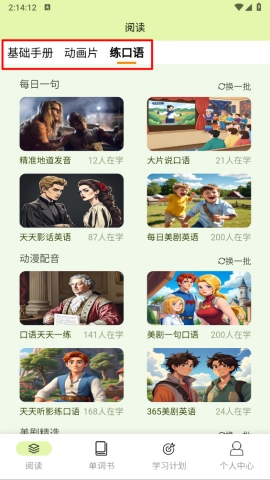 2、首页界面展现出基础手册、动画视频和口语练习模块,你可以根据自己的学习目标自由选择点击。