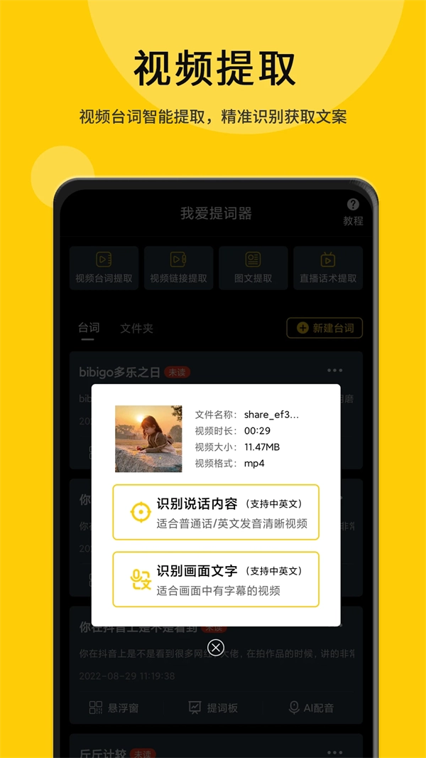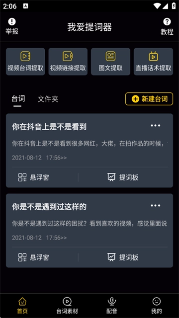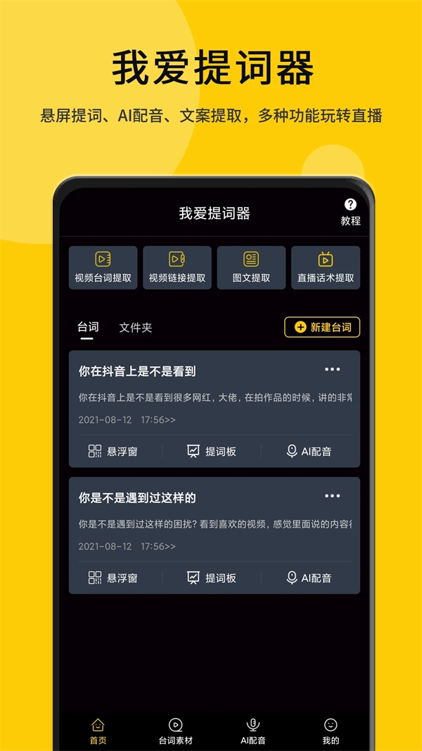 我爱提词器是一款直播和短视频达人都爱用的提词神器,不仅能在您录制台词和直播时悬浮提词,还提供了非常实用热门的话术素材,AI配音 。
