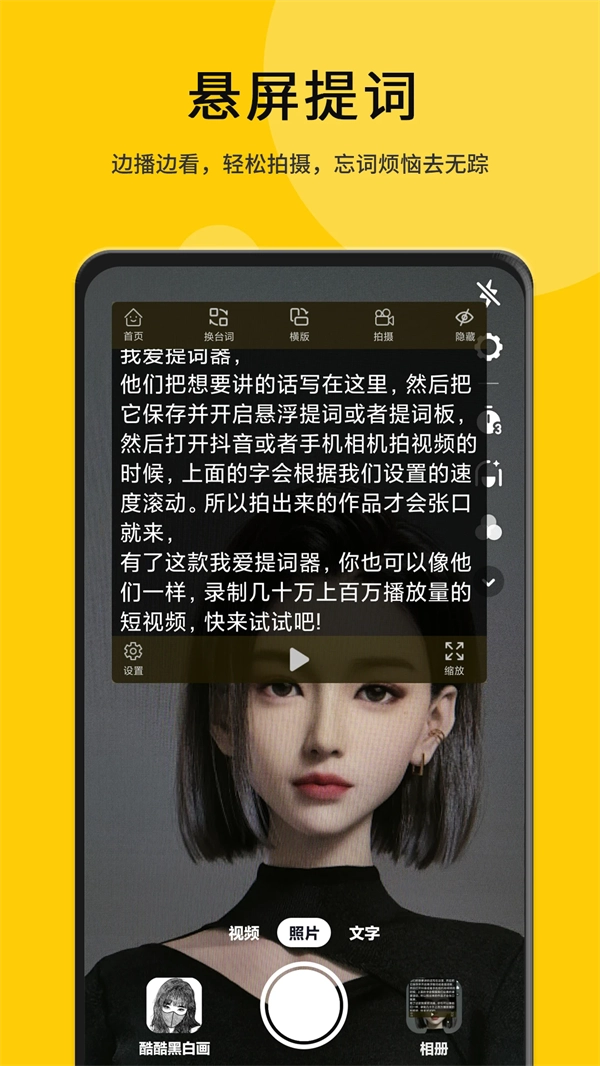 悬浮窗能够与任意拍摄软件配合使用,对当下市场上主流的短视频软件以及美颜相机等,均提供提词效果支持。