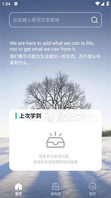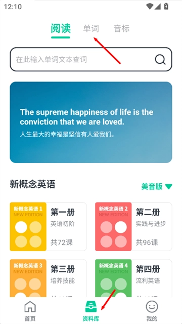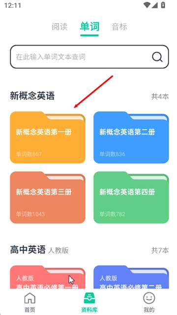 1、打开不学英语,进入资料库页面,点击“单词”进入学习模块。