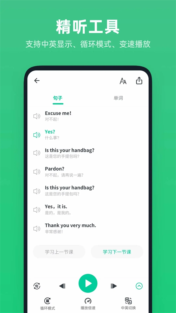 - 进行单句单篇的精听练习,可自行设定播放语速与播放模式。