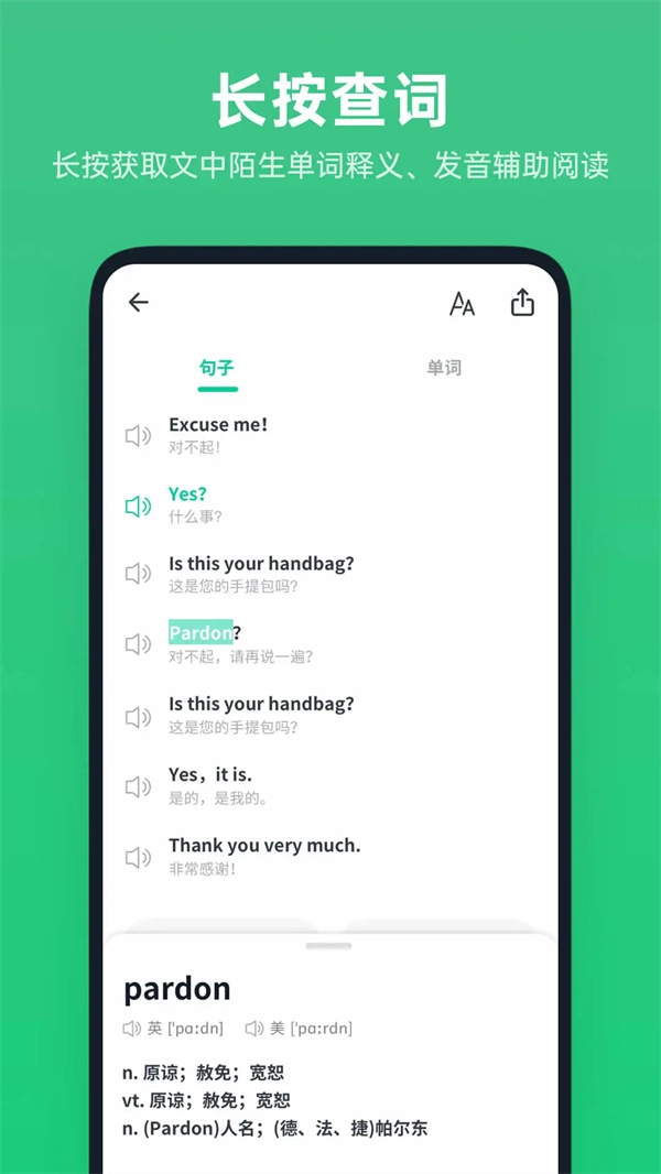 长按即可获取文中陌生单词的释义及发音,助力阅读。