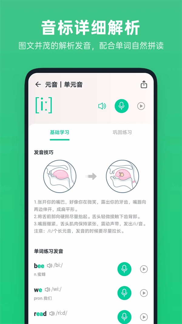 对于零基础的英语自学者而言,可借助48个英语音标的发音技巧开启学习之旅。采用图文并茂的形式,引导用户从零基础起步,由浅入深地学习音标,并通过发音练习,强化英语自然拼读能力。当自学者有所进阶后,通过经典内容学习体系,助力用户掌握英语听、说、读、写这4项基本技能,让用户在学习过程中最大程度地挖掘自身潜能。