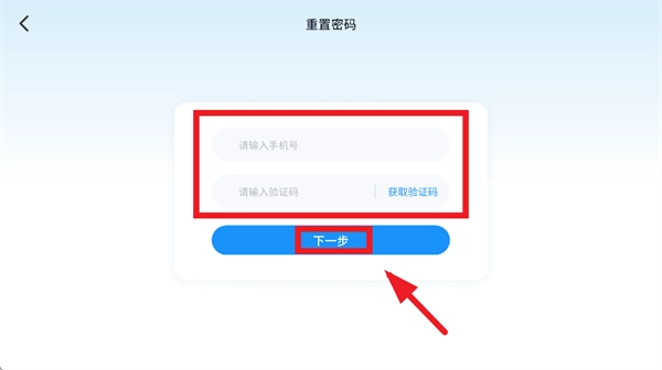 于重置密码页面,输入手机号码与验证码,接着点击“下一步”,随后进行密码设置即可。