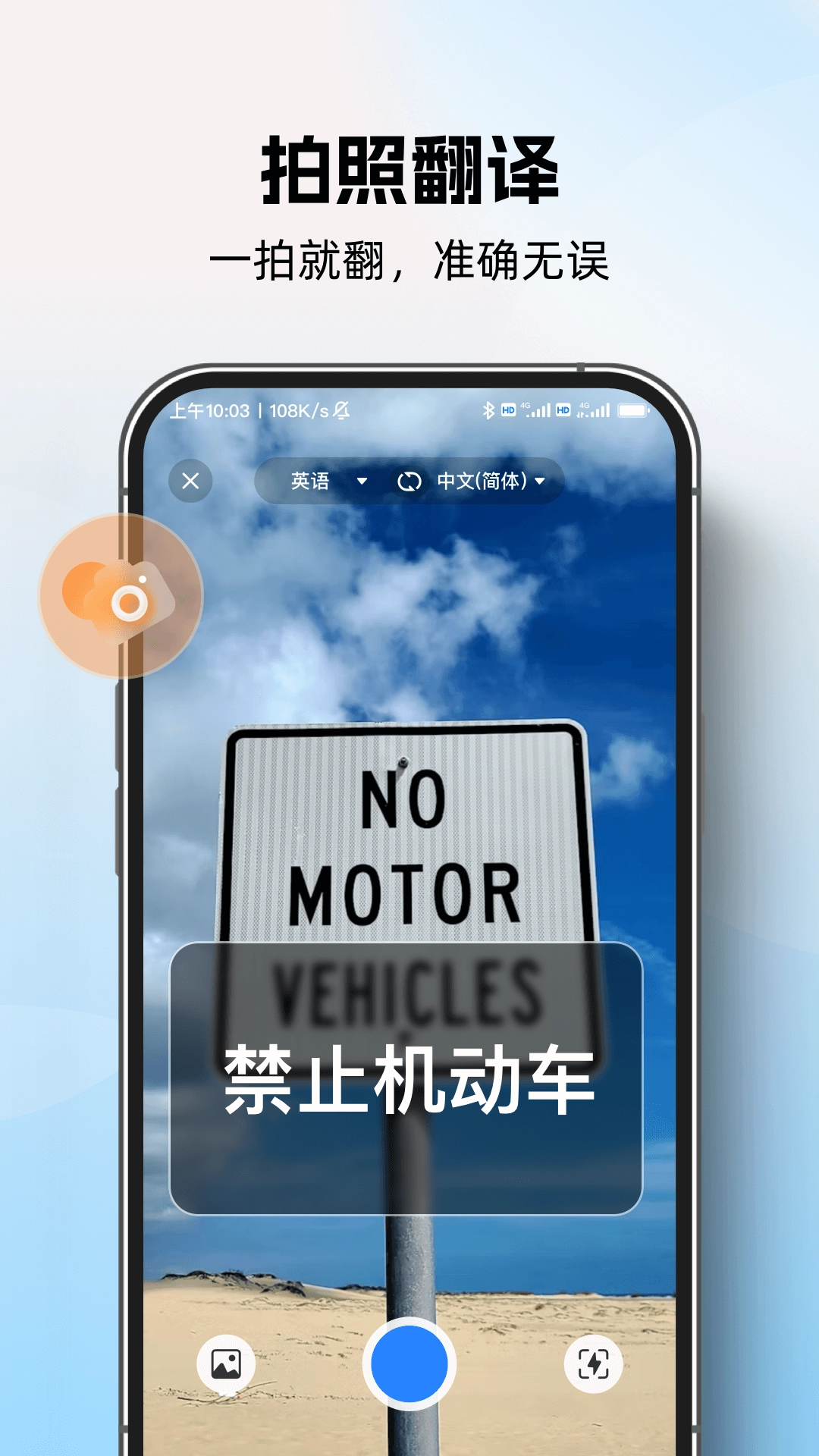 手机简单一拍,强大的OCR摄像头取词和拍照翻译功能,让你所需要的语言内容立刻显现,无需手动输入便可快速翻译多种语言,满足出国翻译、旅行翻译、旅游购物翻译、英语学习翻译等需求。