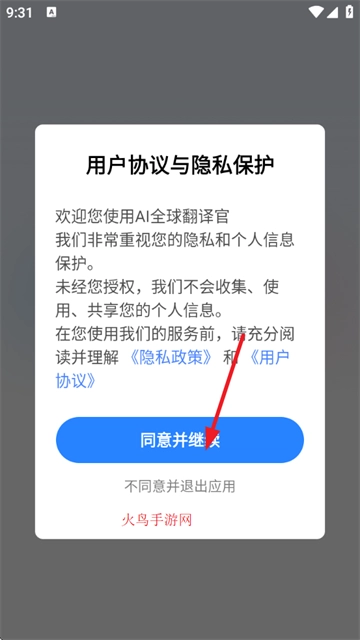 1、第一步,打开AI全球翻译官,仔细阅读“用户协议与隐私保护”后点击同意。